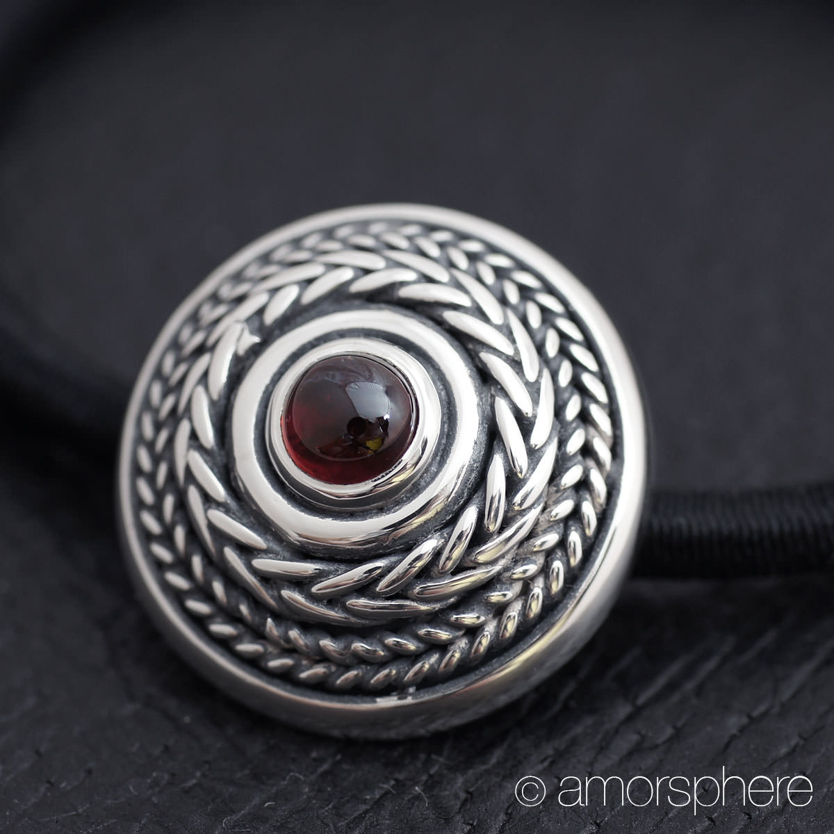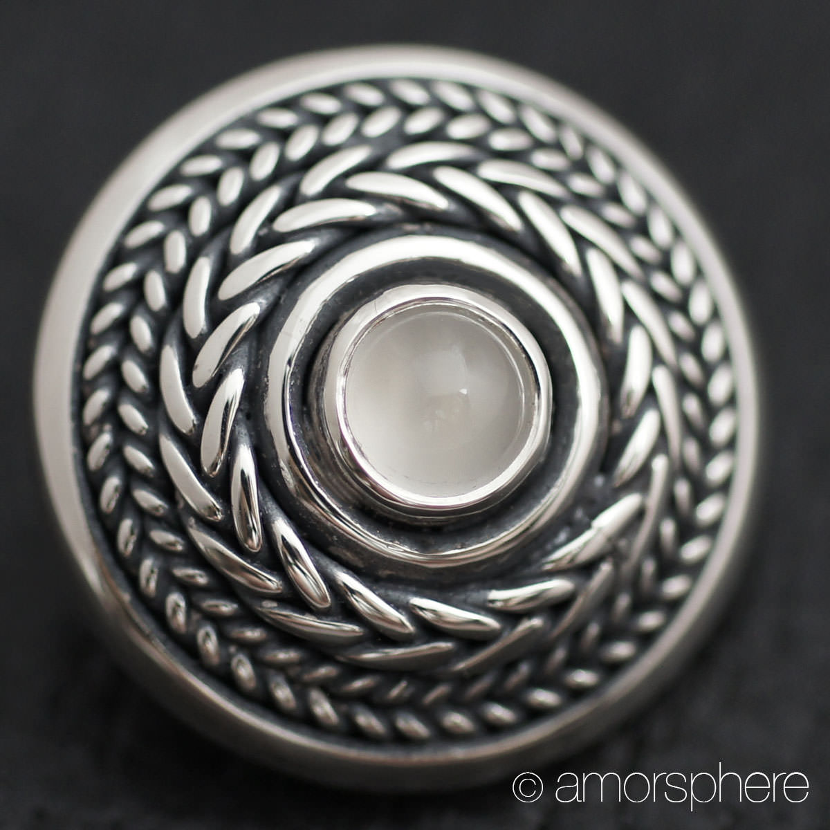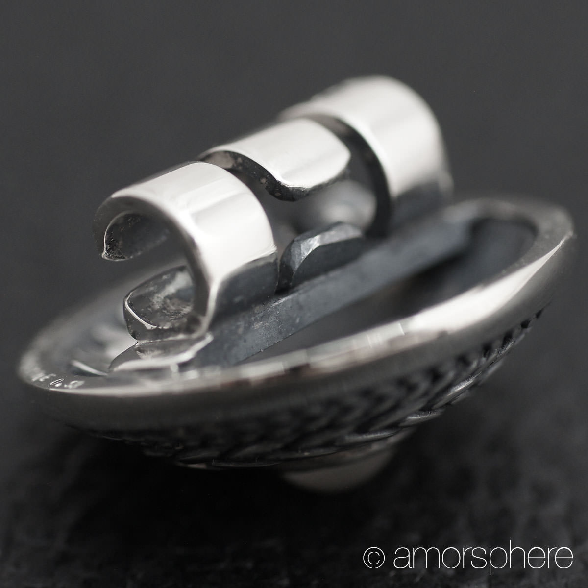 ツルッとした直径6mmのカボションカットを中心にドーム状に手編みの三つ編み、二本のワイヤーをツイストしたものを合わせて奥行きのある落ち着いた雰囲気に仕上がっています。